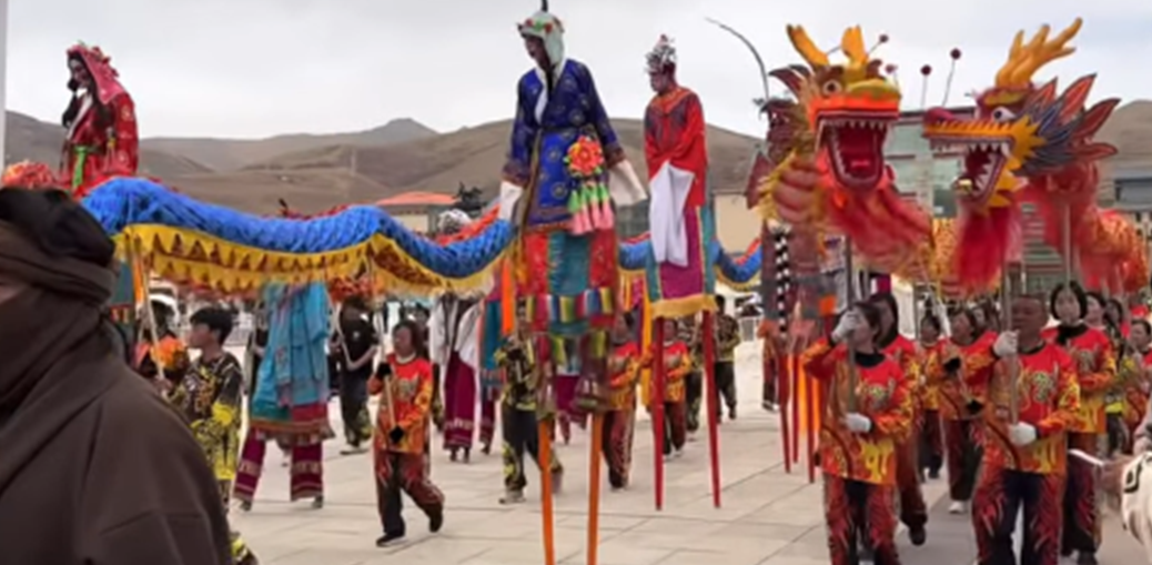 Maczen, typowo pasterski okręg w tzw. Tybetańskiej Prefekturze Autonomicznej Golog. Święto Latarni. Przez (centralny) Plac Gesara idzie pochód na szczudłach, wykonują taniec smoka i lwa, walą w wielkie bębny. Nie mam pojęcia, czy to ma być król Gesar i królowa Drugmo czy król Songcen Gampo i księżniczka Wencheng.
